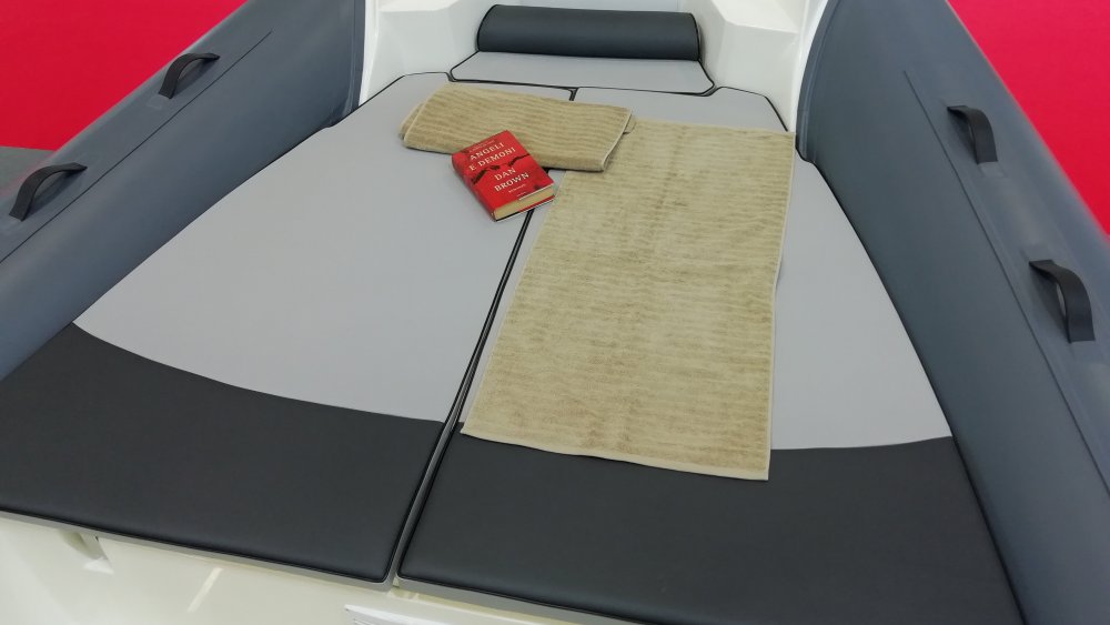 Flotteur hyplaon néoprène gris Artic / Davier avec taquet et baille à mouillage / bain de soleil avant / Grand coffre de rangement avant / Bain de soleil.