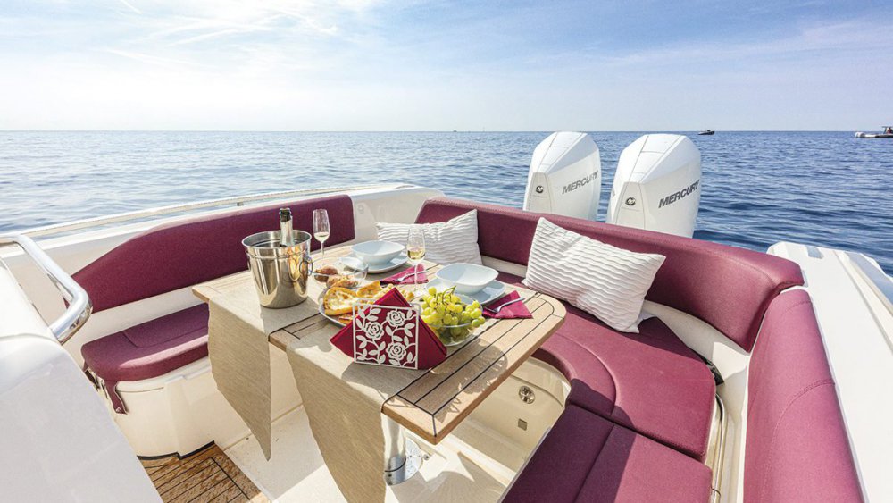 Guindeau électrique avec mouillage / Coussins de bain de soelil avant / Assise pilote 2 places.