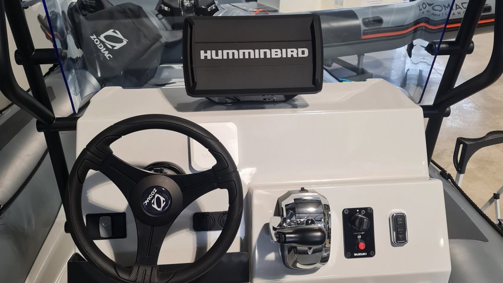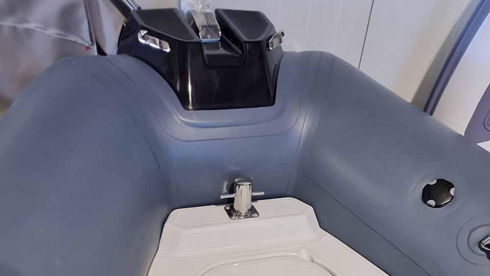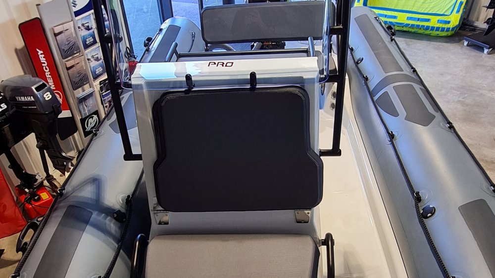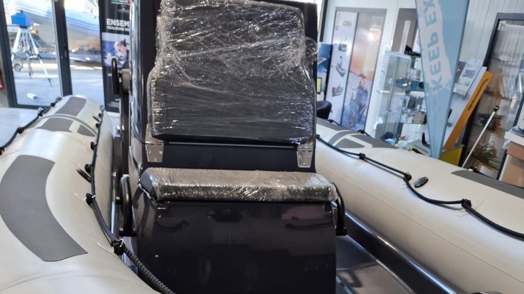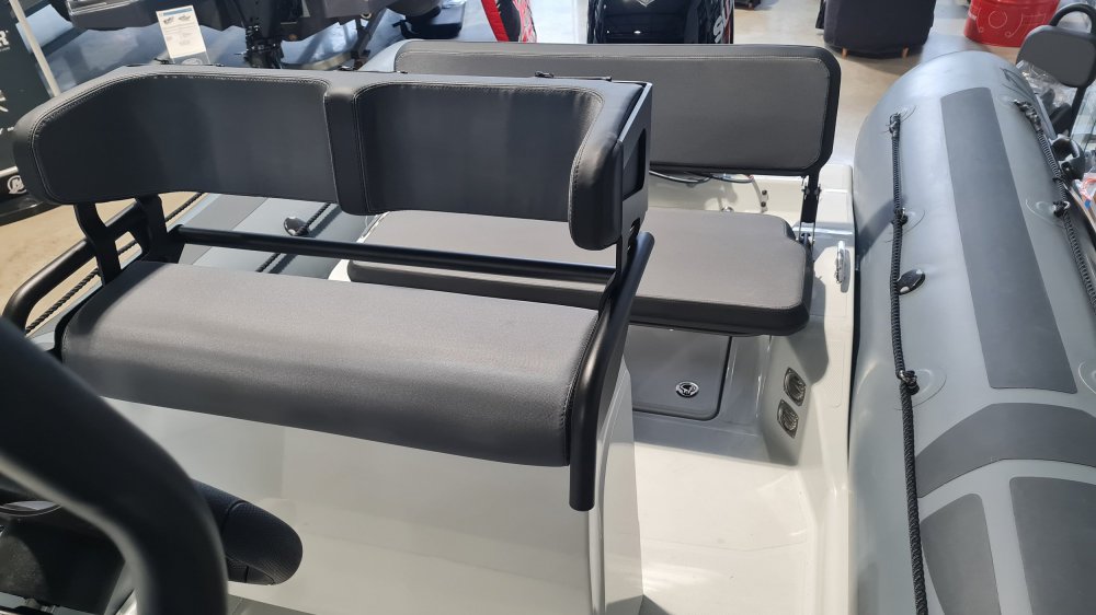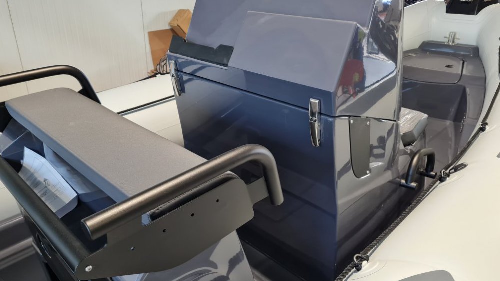 Coque gris clair / Flotteur hypalon néoprène amovible gris artic / Console HXLS avec assise avant et grand coffre de rangement / Bolster Pro polyester avec rangement / Banquette arrière / Direction hydraulique / Combiné sondeur GPS Garmin 92 avec carte / Bitte d'amarrage avant, taquets arrière / Grand coffre sous pont / Réservoir carburant 200L.